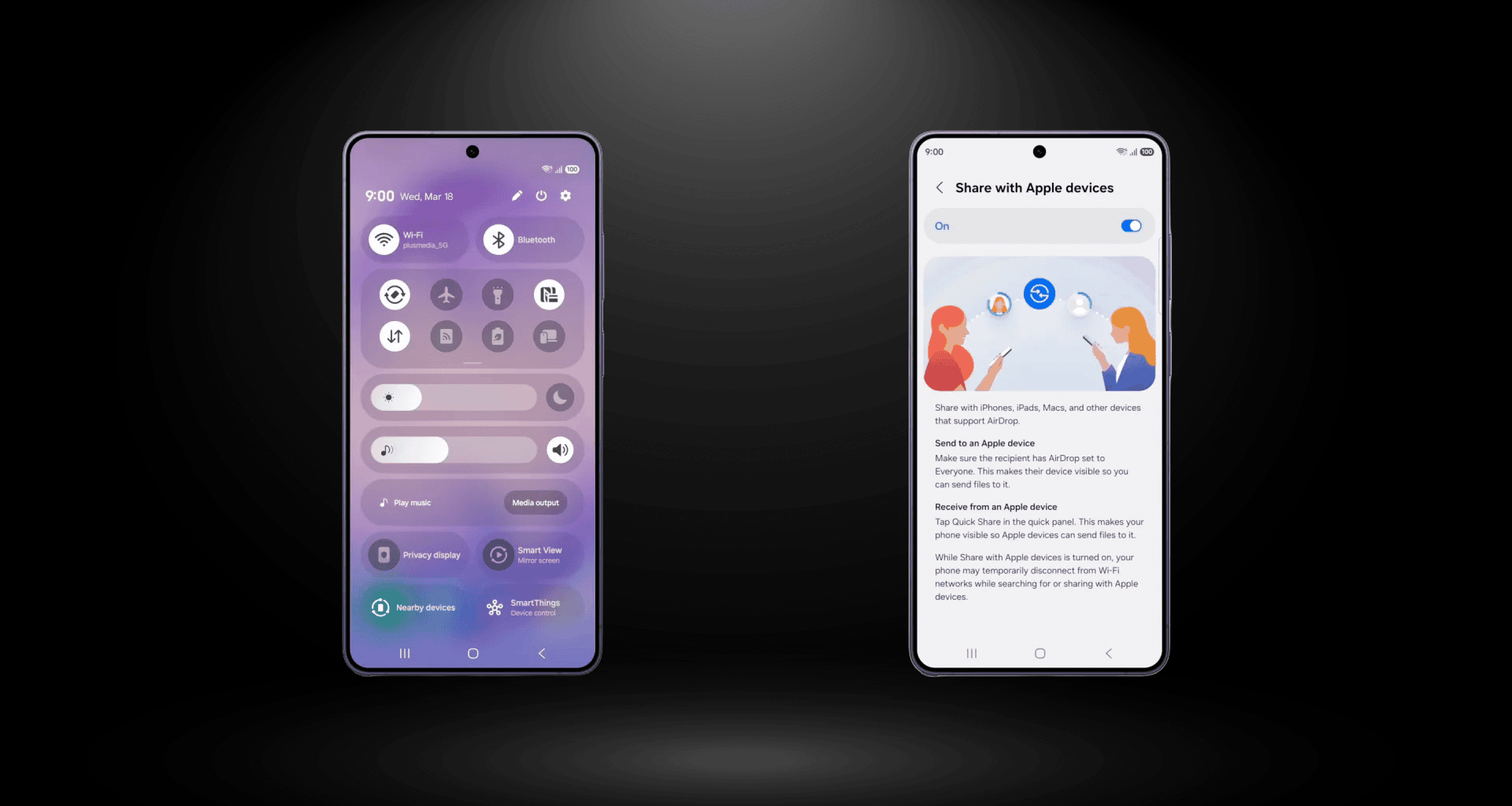 Samsung har börjat erbjuda support för AirDrop på Galaxy S26, S26+ och S26 Ultra Från och med den 23 mars 2026, med början i Sydkorea. Funktionaliteten är integrerad i Snabb delningSamsungs inbyggda verktyg för snabb filöverföring, vilket möjliggör enkel delning av foton, videor och annat innehåll mellan Galaxy S26-enheter och iPhones, iPads och Macs.